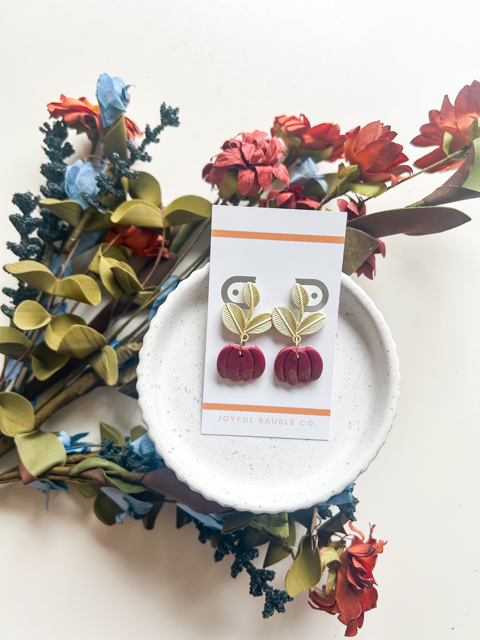 Item : Polymer clay pumpkin earring with gold brass metal leaf accents.