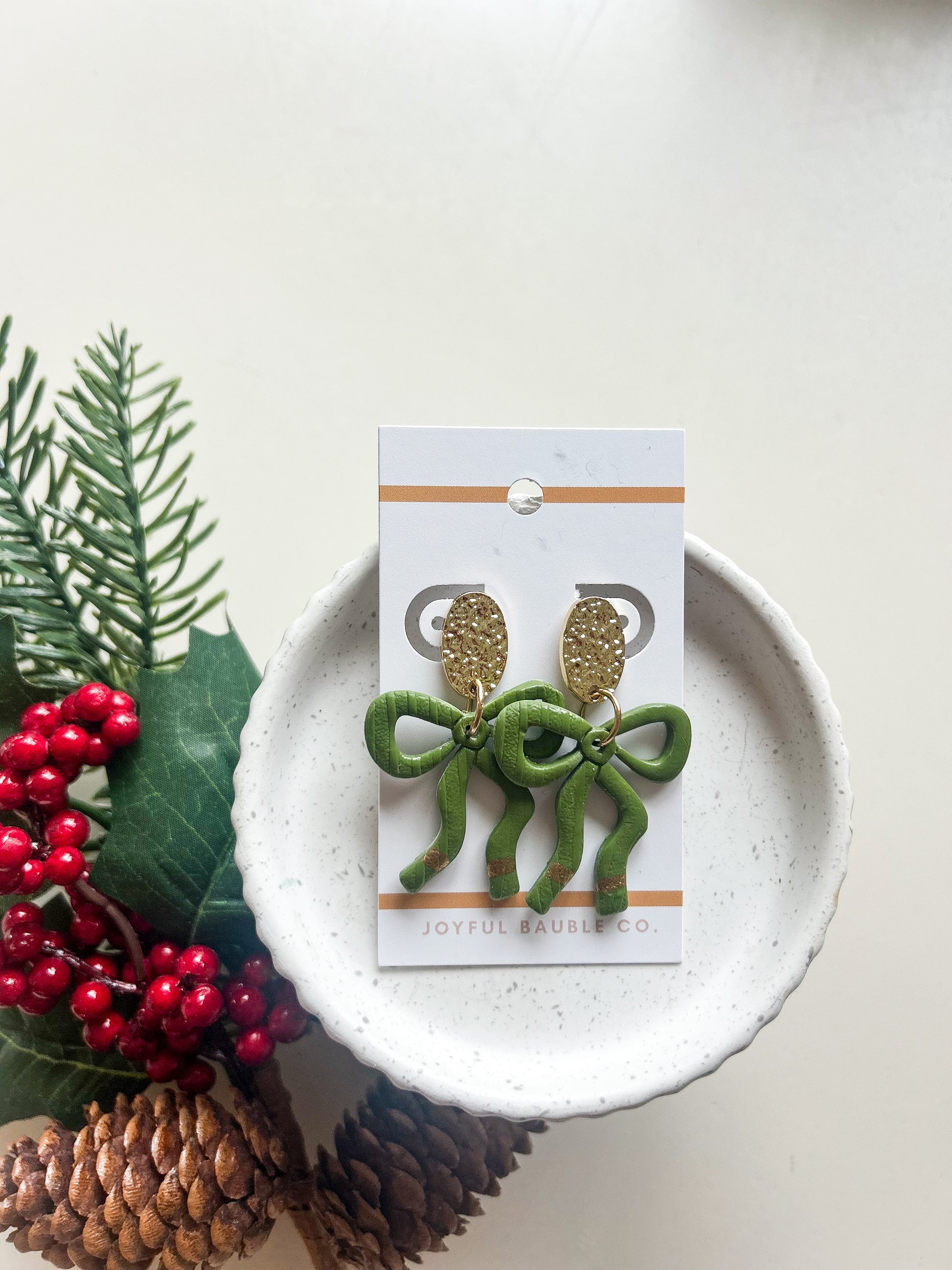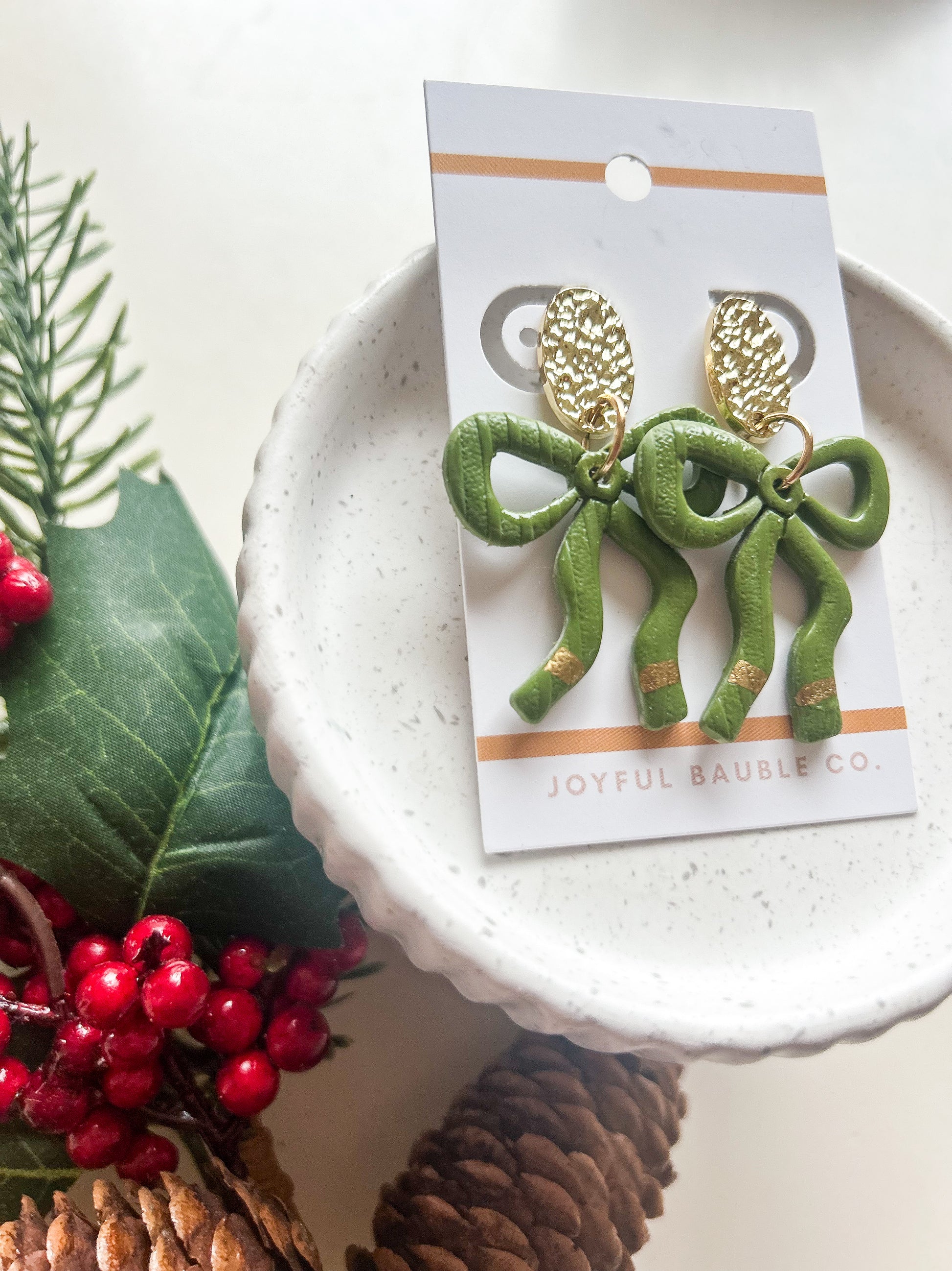 Item : Polymer clay bow earring with brass metal stud accents. Textured design, hand painted details