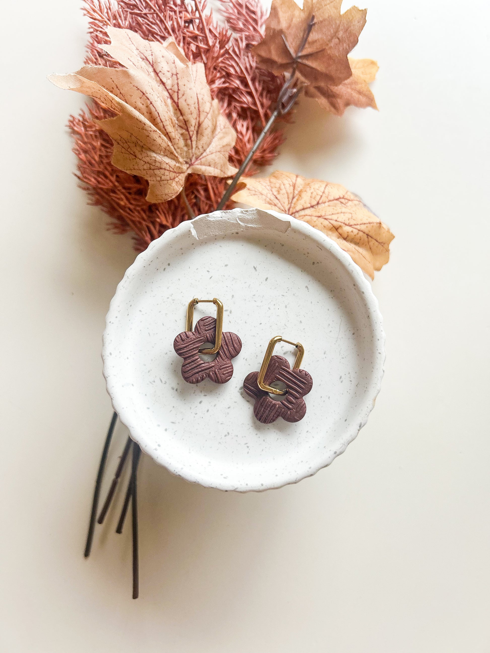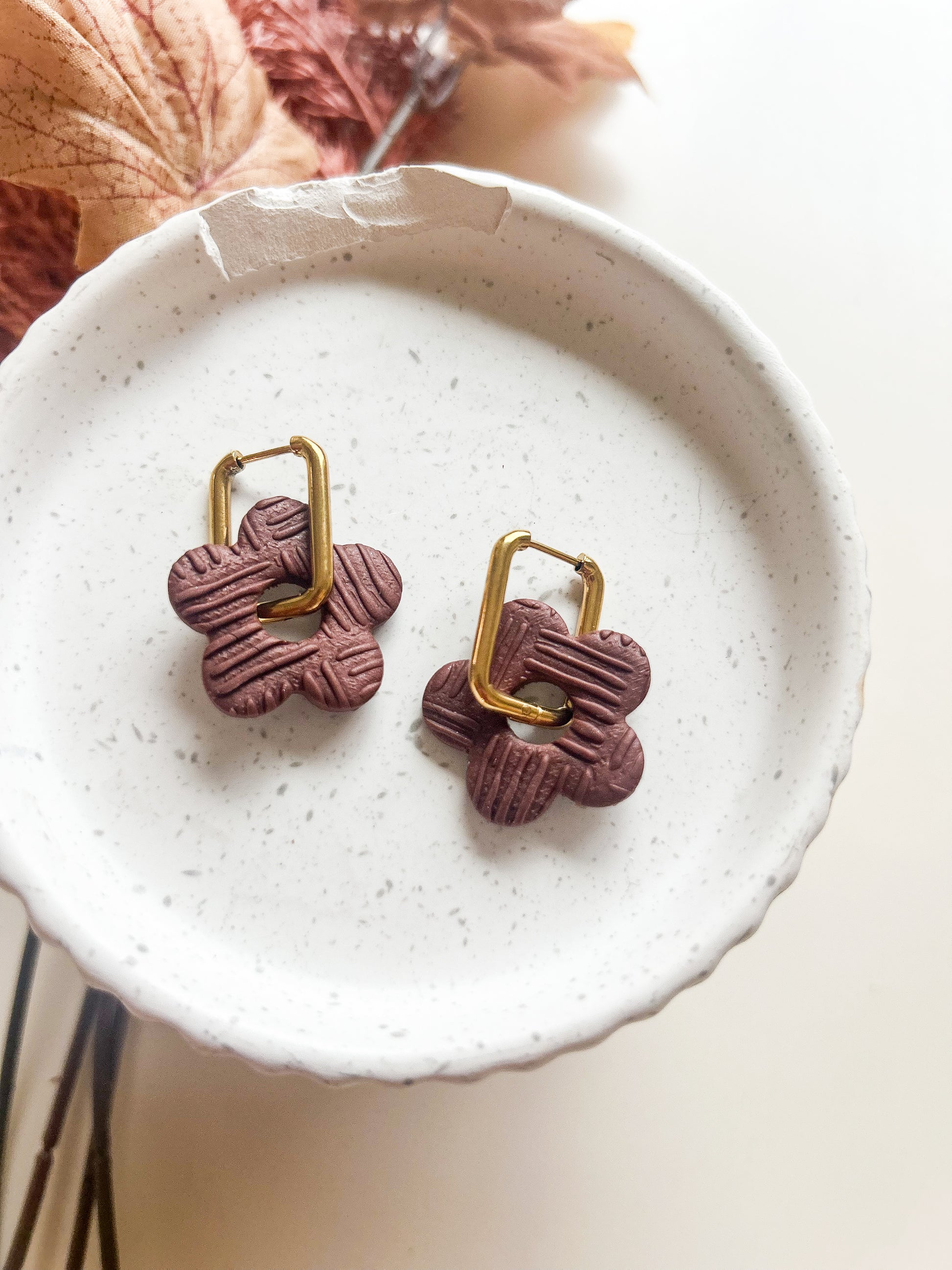 item: Polymer clay flower earring with gold plated brass metal hoop. Textured