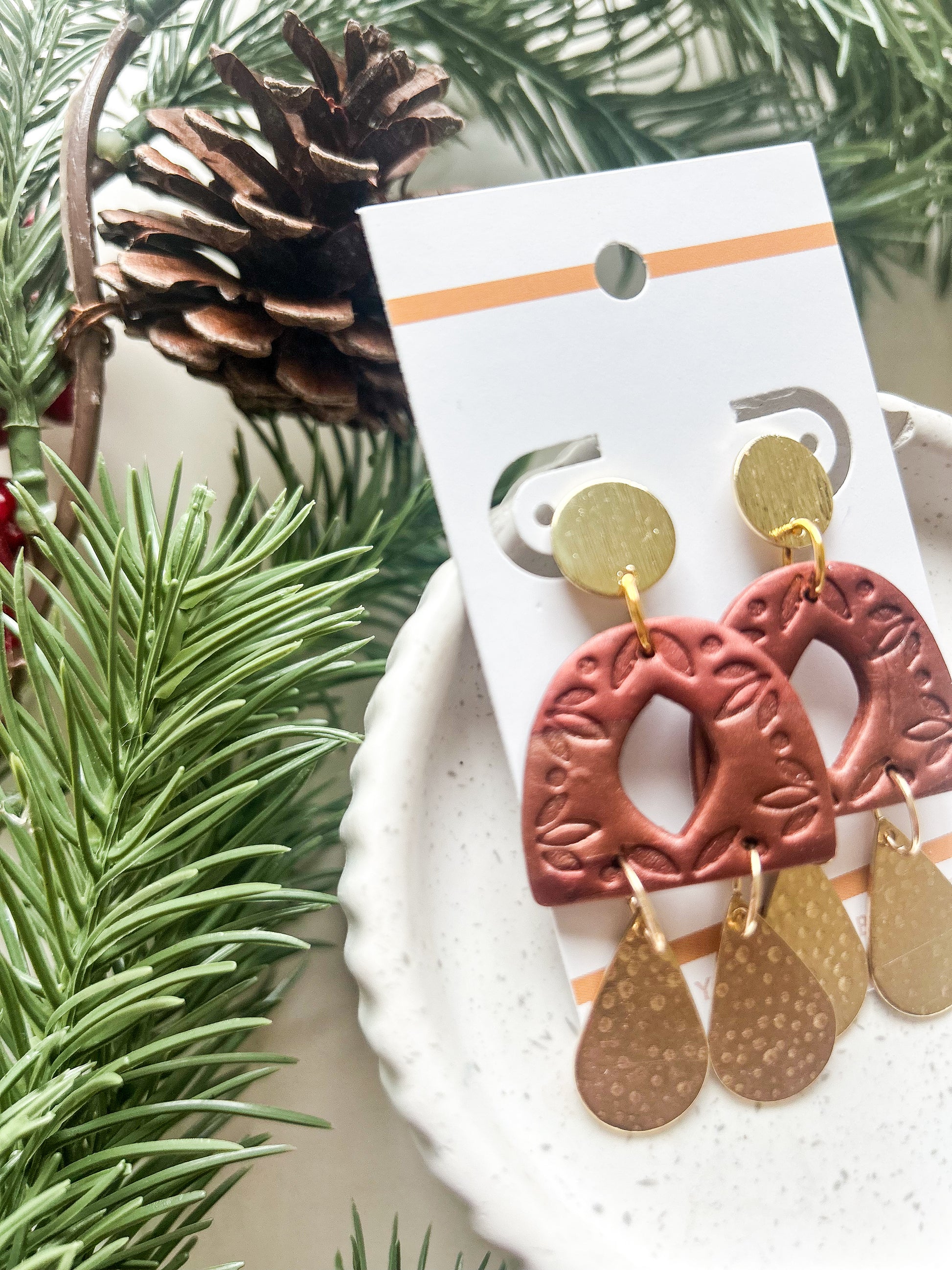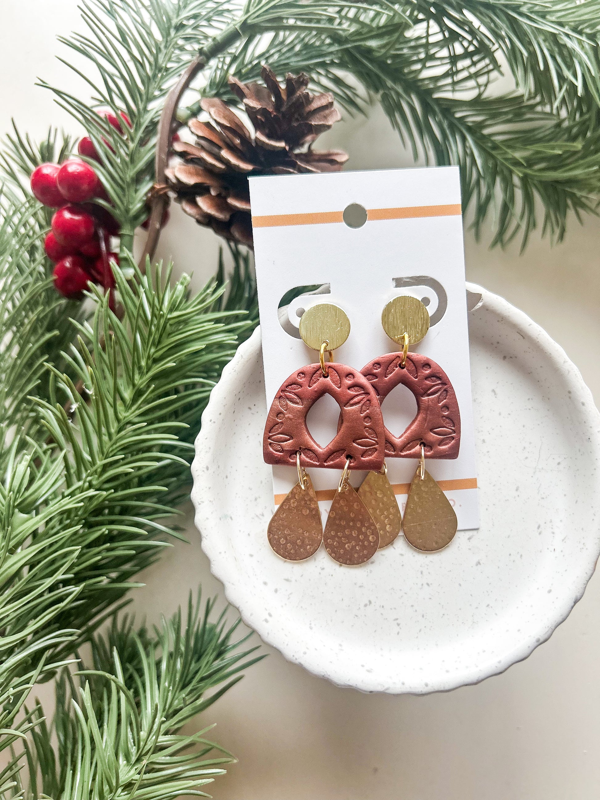 Item : Polymer clay whimsical arch with brass metal dangle accents. Textured design