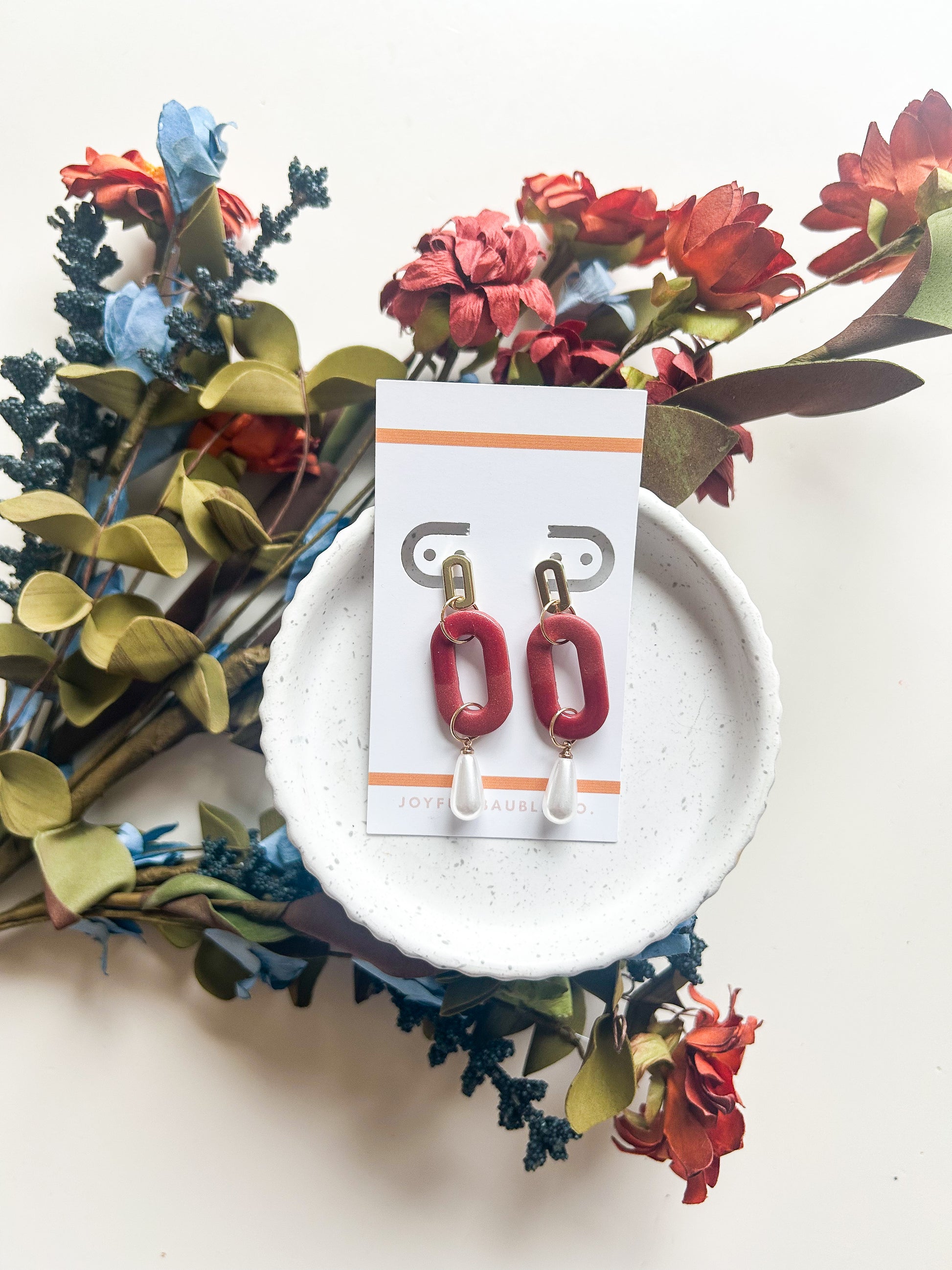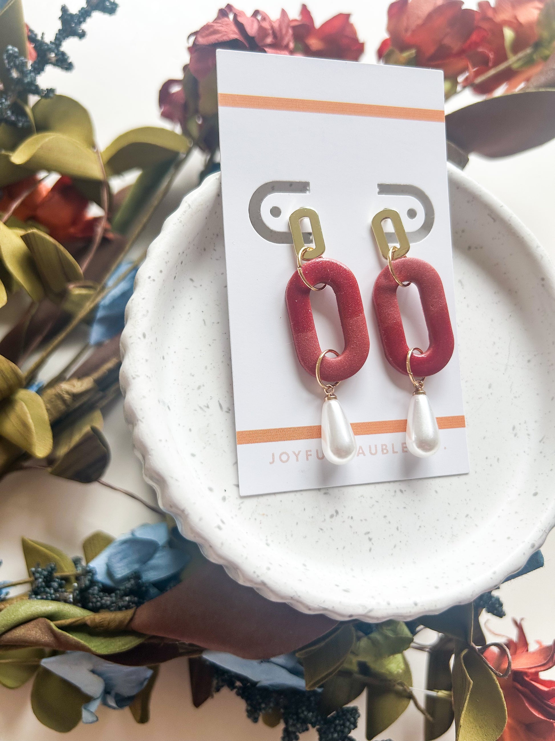 Item : Polymer clay oval earring with pearl dangle accent. Hand painted