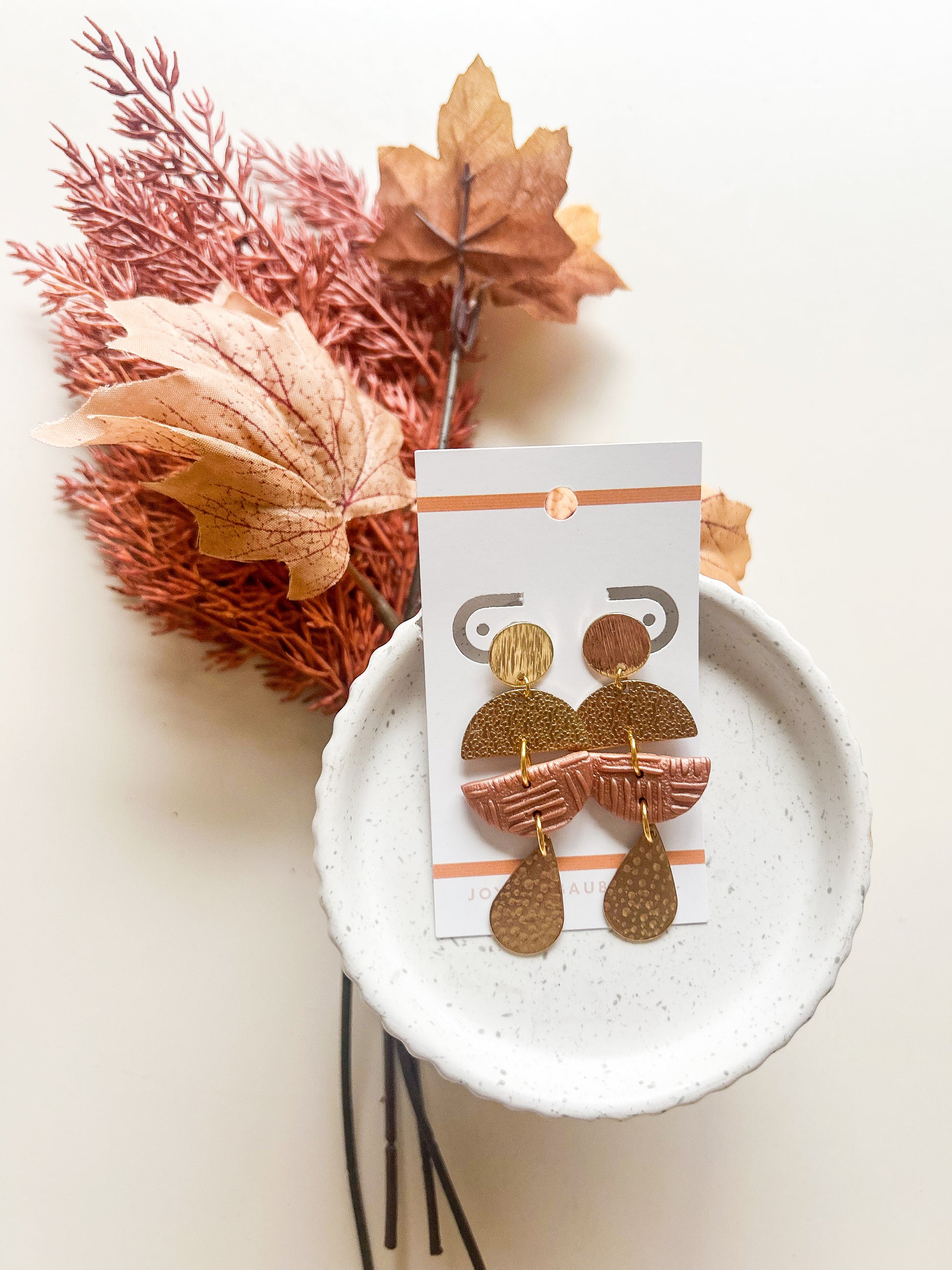 Item : Polymer clay half circle with gold brass metal dangle accents. textured