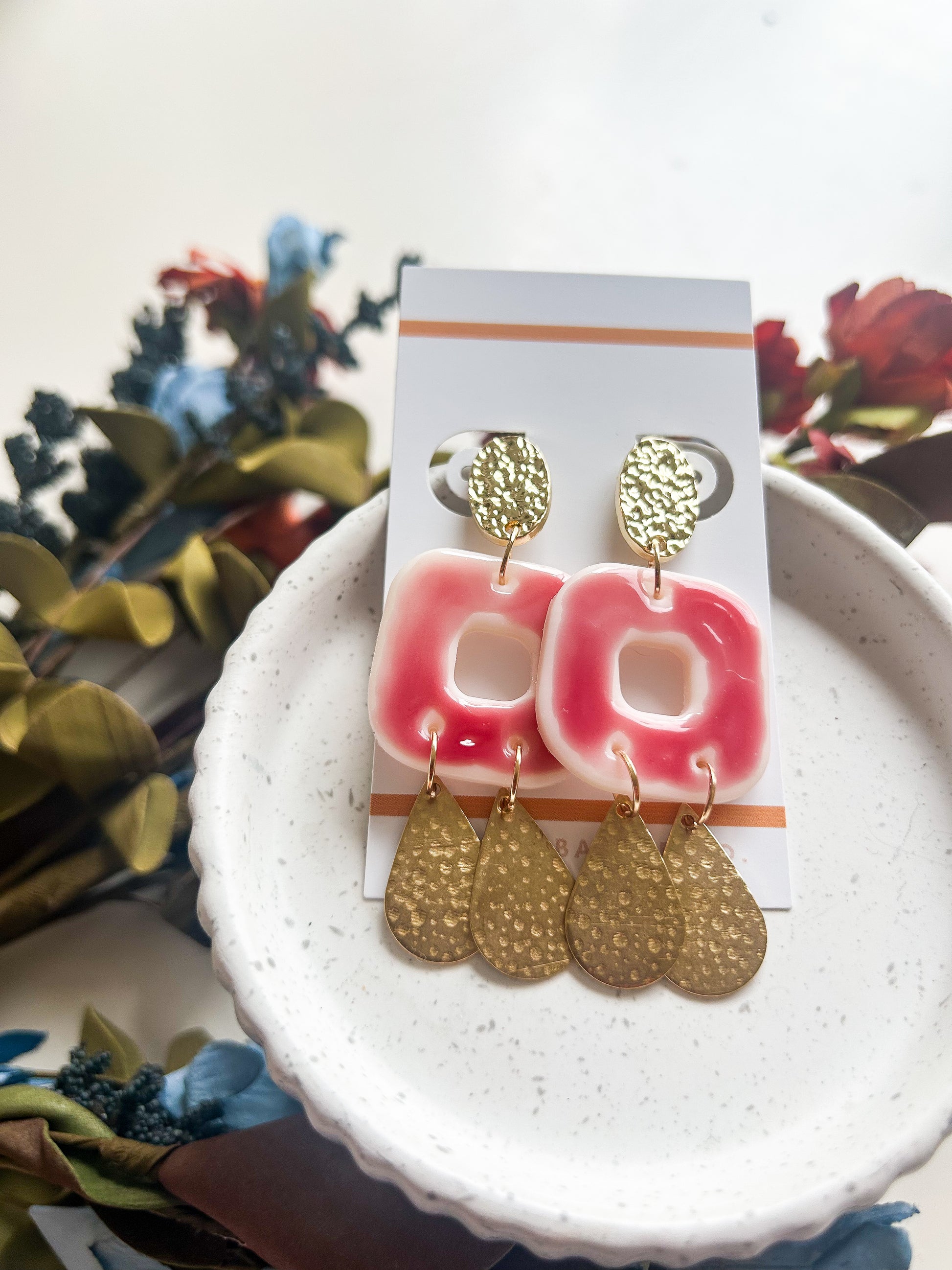 Item : Polymer clay bubble square with gold brass metal dangle accents.