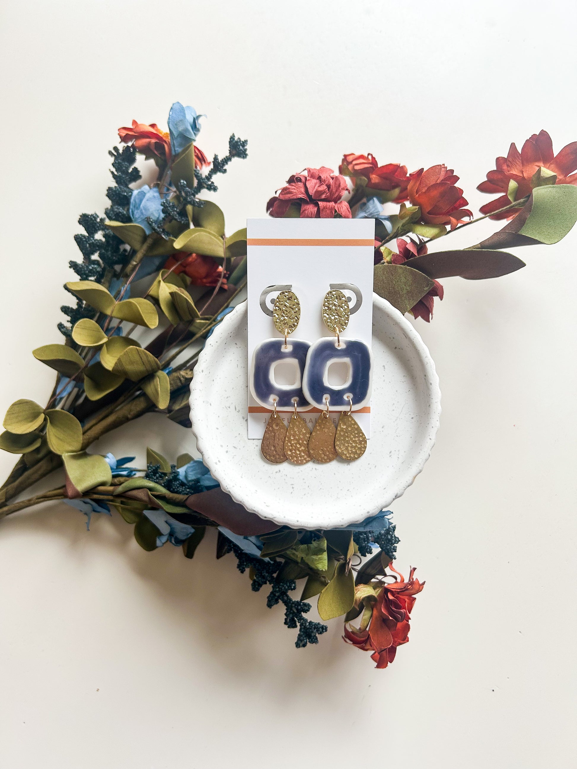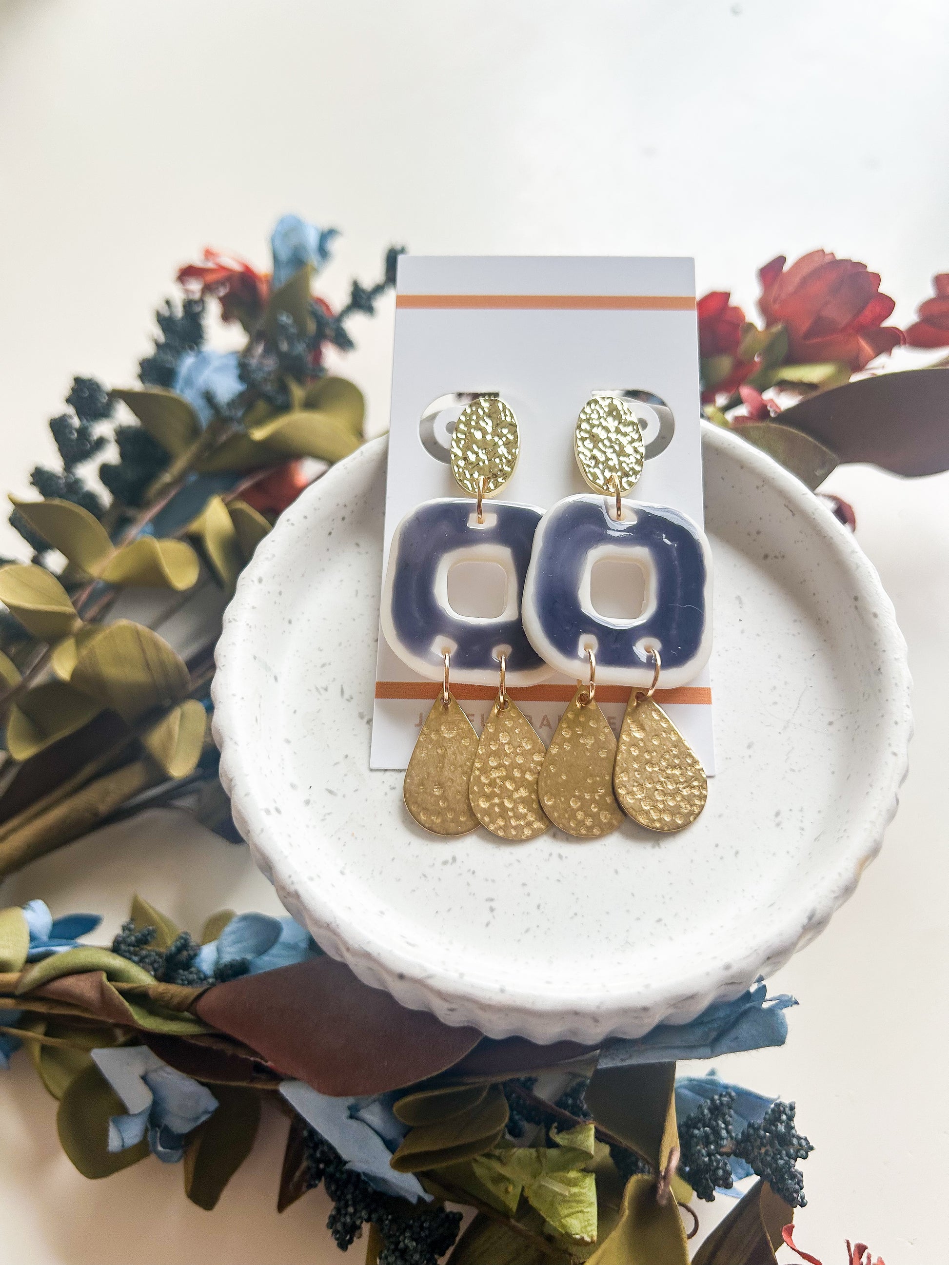 Item : Polymer clay bubble square with gold brass metal dangle accents.