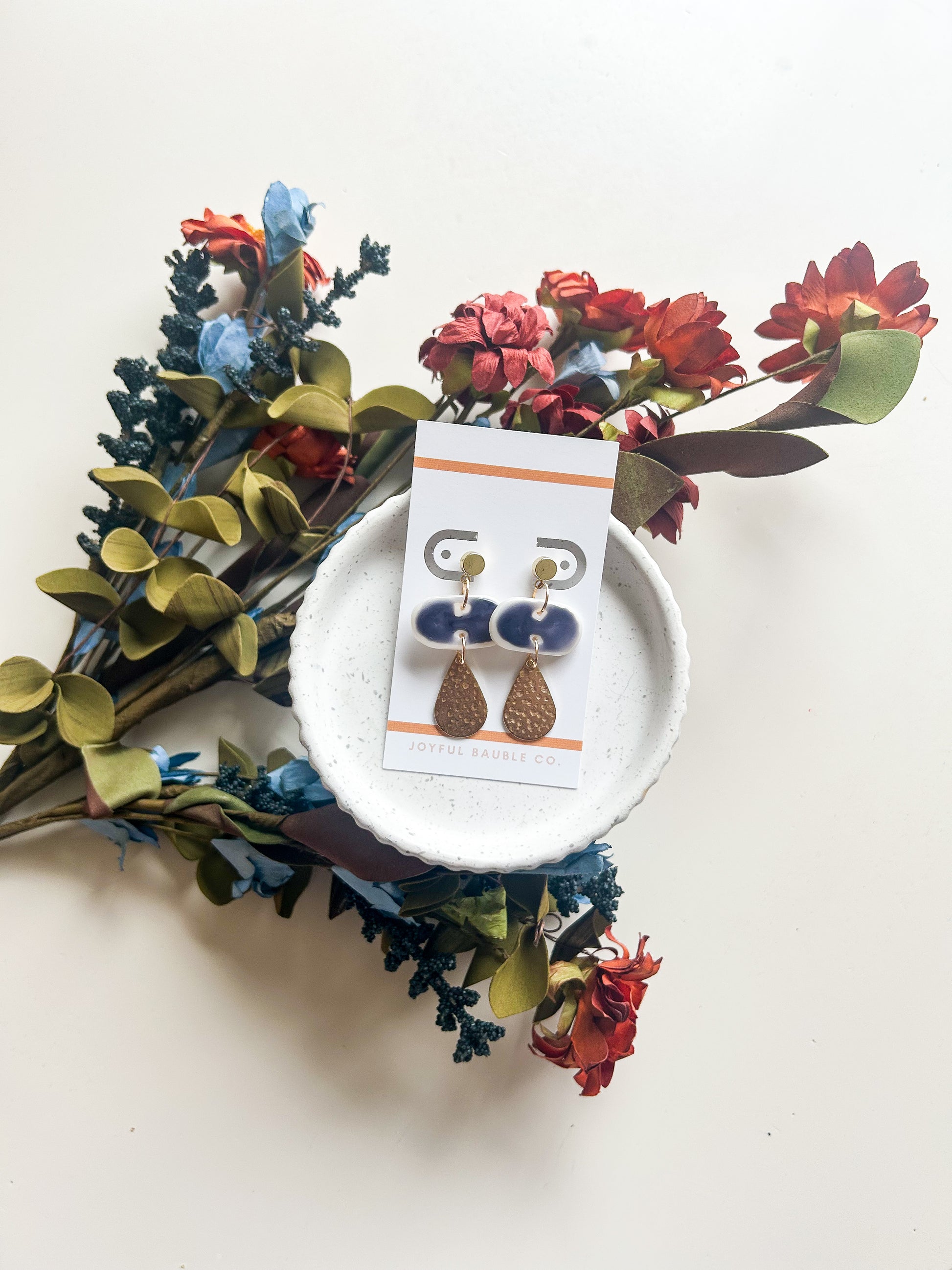 Item : Polymer clay oval earring with gold brass metal dangle accents.