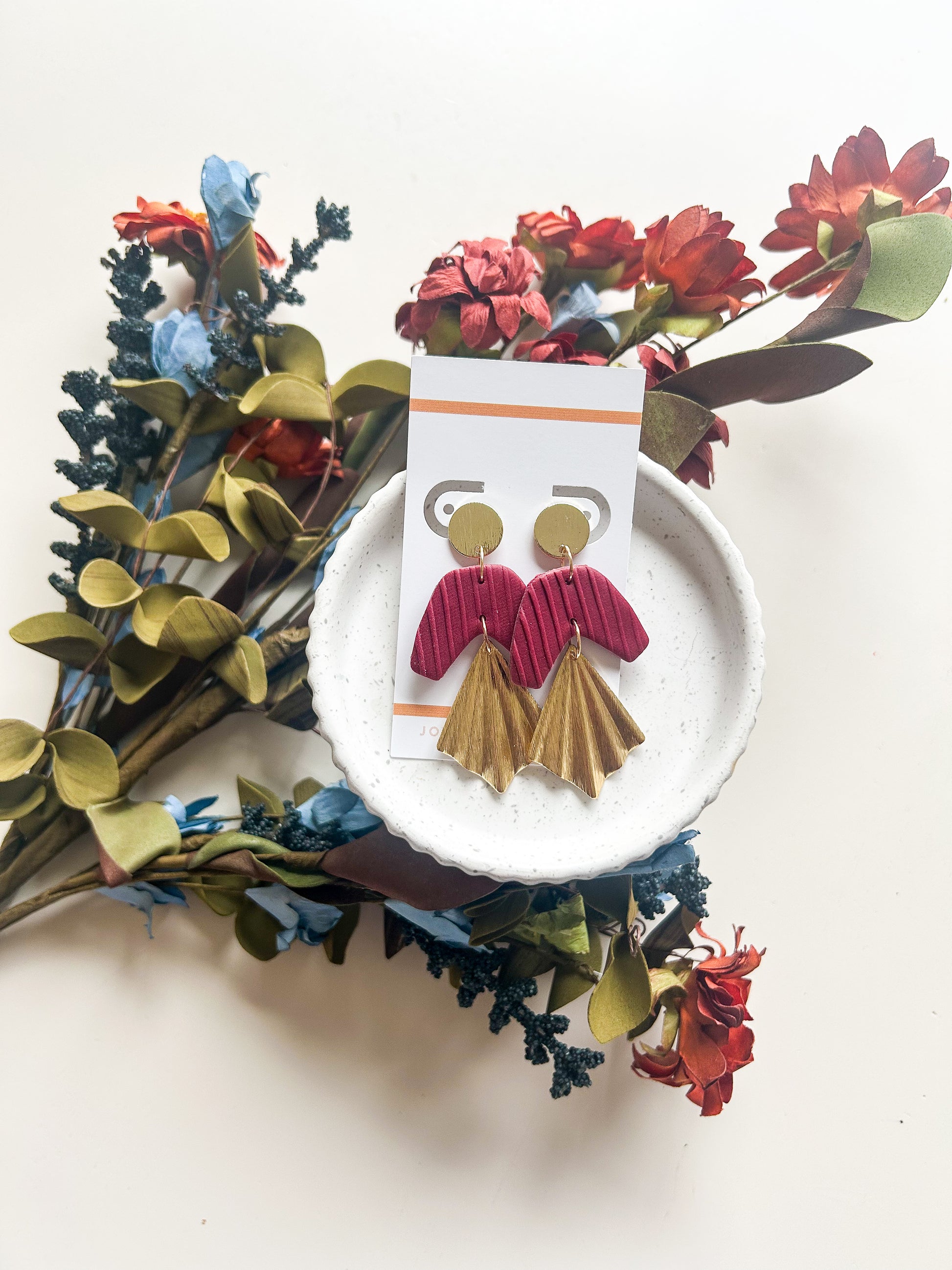 Item : polymer clay statement earring with brass metal fan accent. Lined detailing