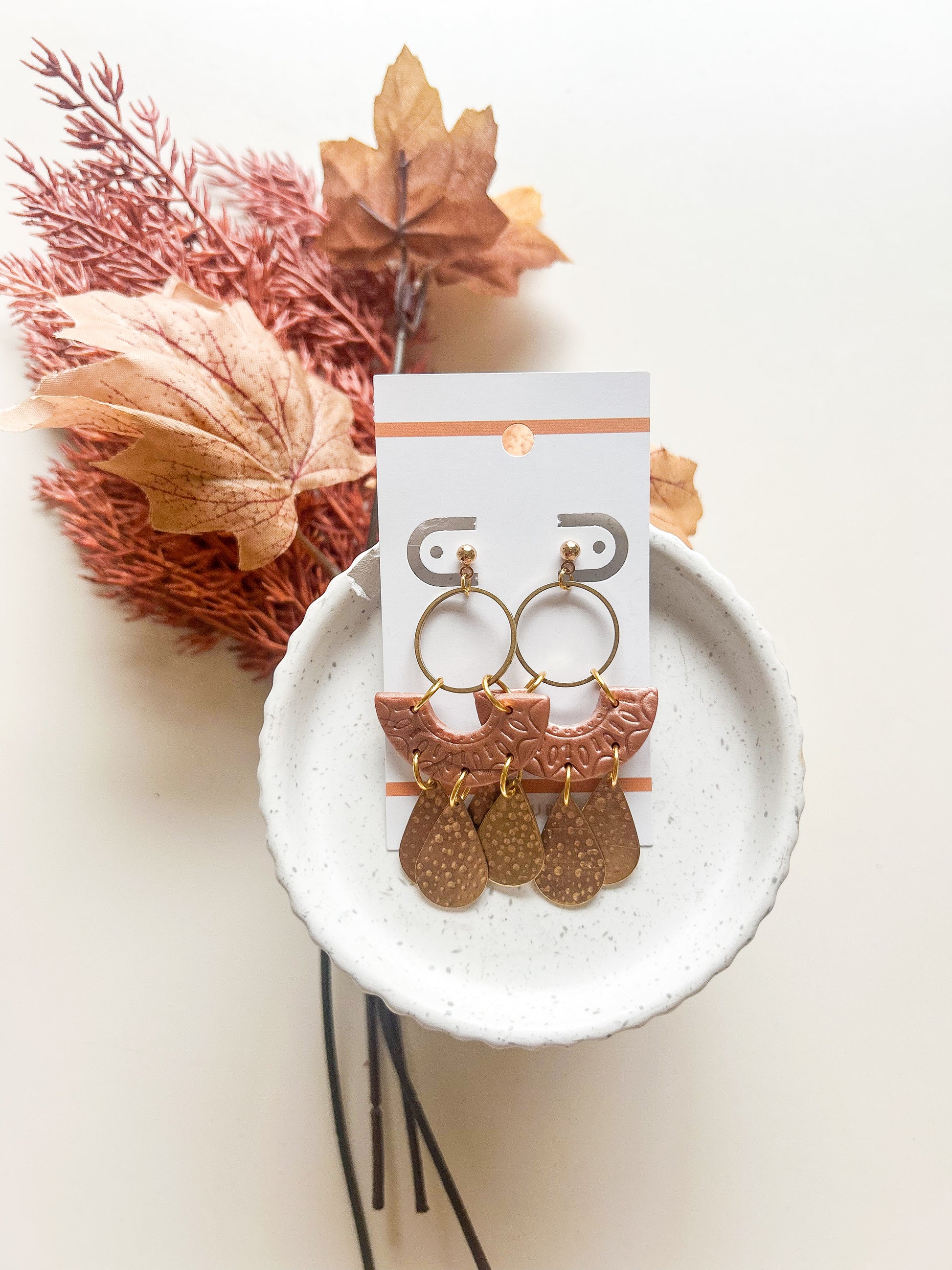 Item : Polymer clay arch with brass teardrop dangle accents. Art Deco