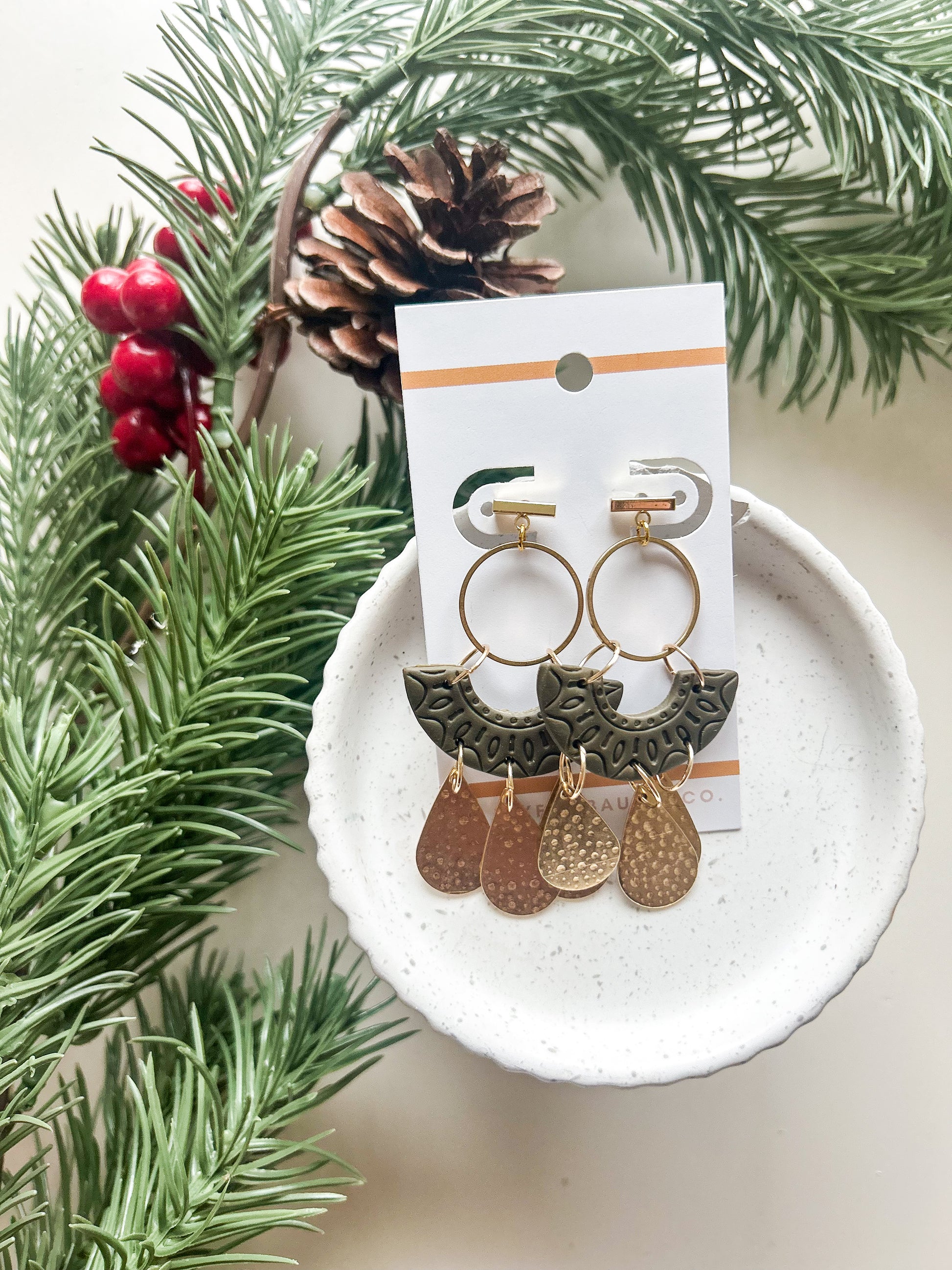 Item : Polymer clay arch with brass teardrop dangle accents. Art Deco