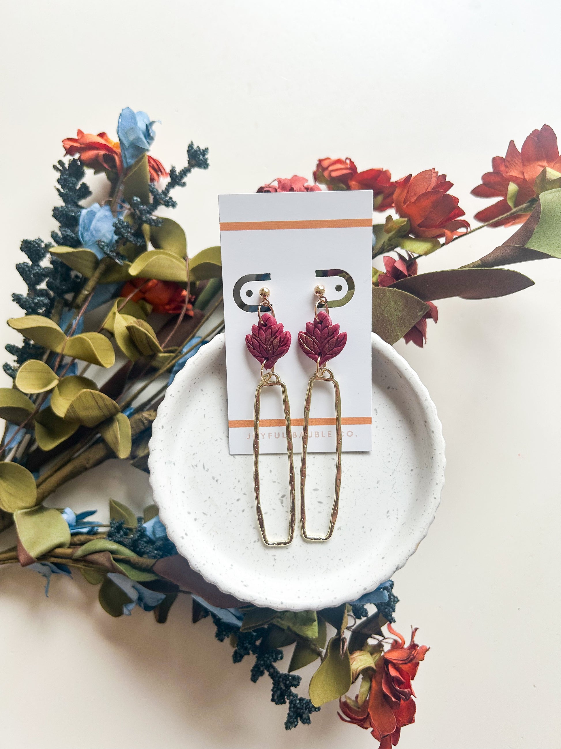 Item : Polymer clay leaf earring with gold brass metal dangle accents.