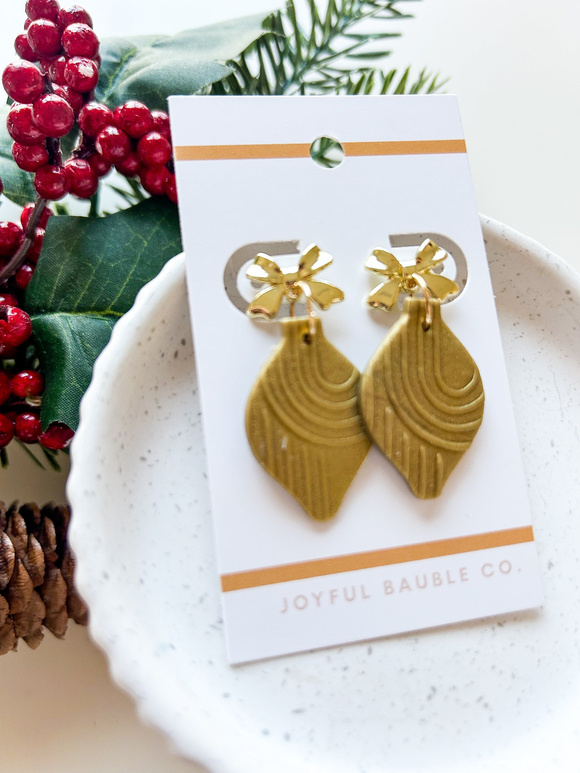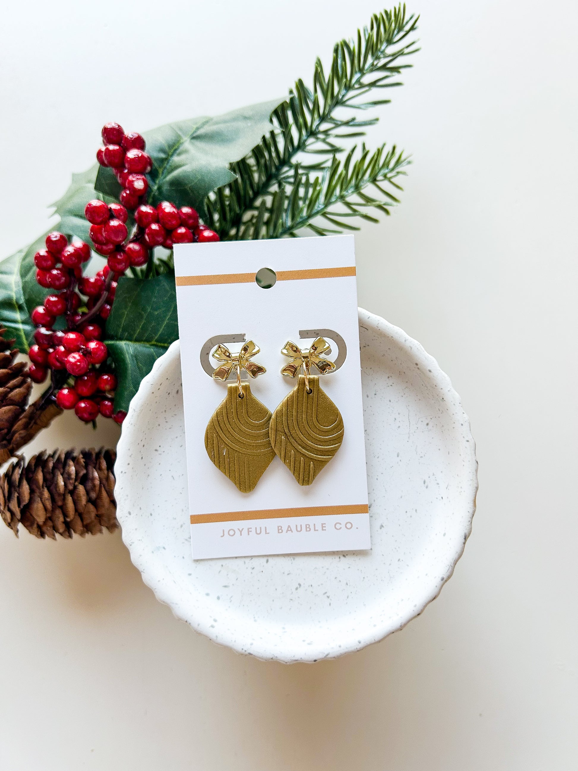 Item : polymer ornament earring with brass metal bow stud. Textured design, hand painted details