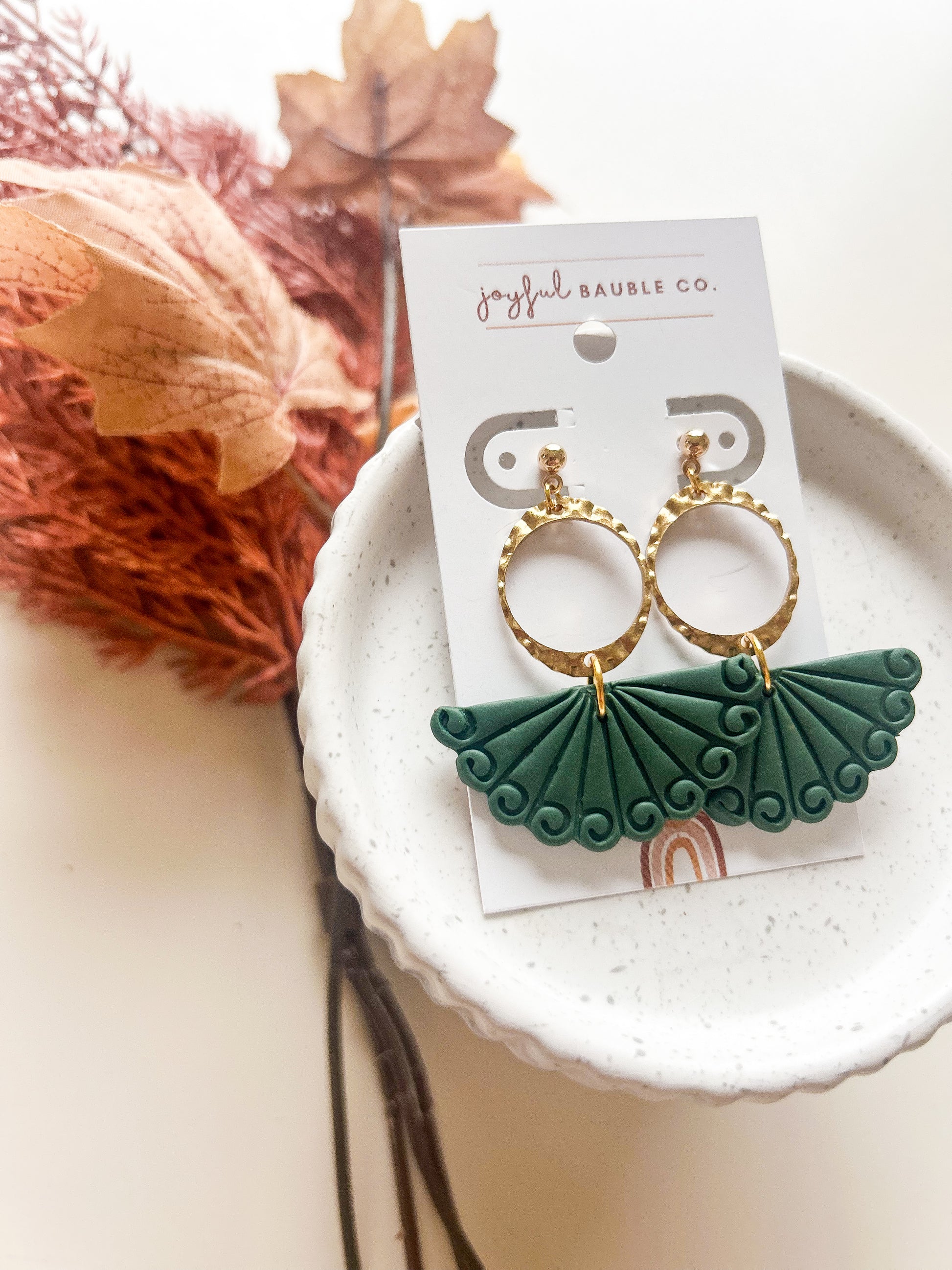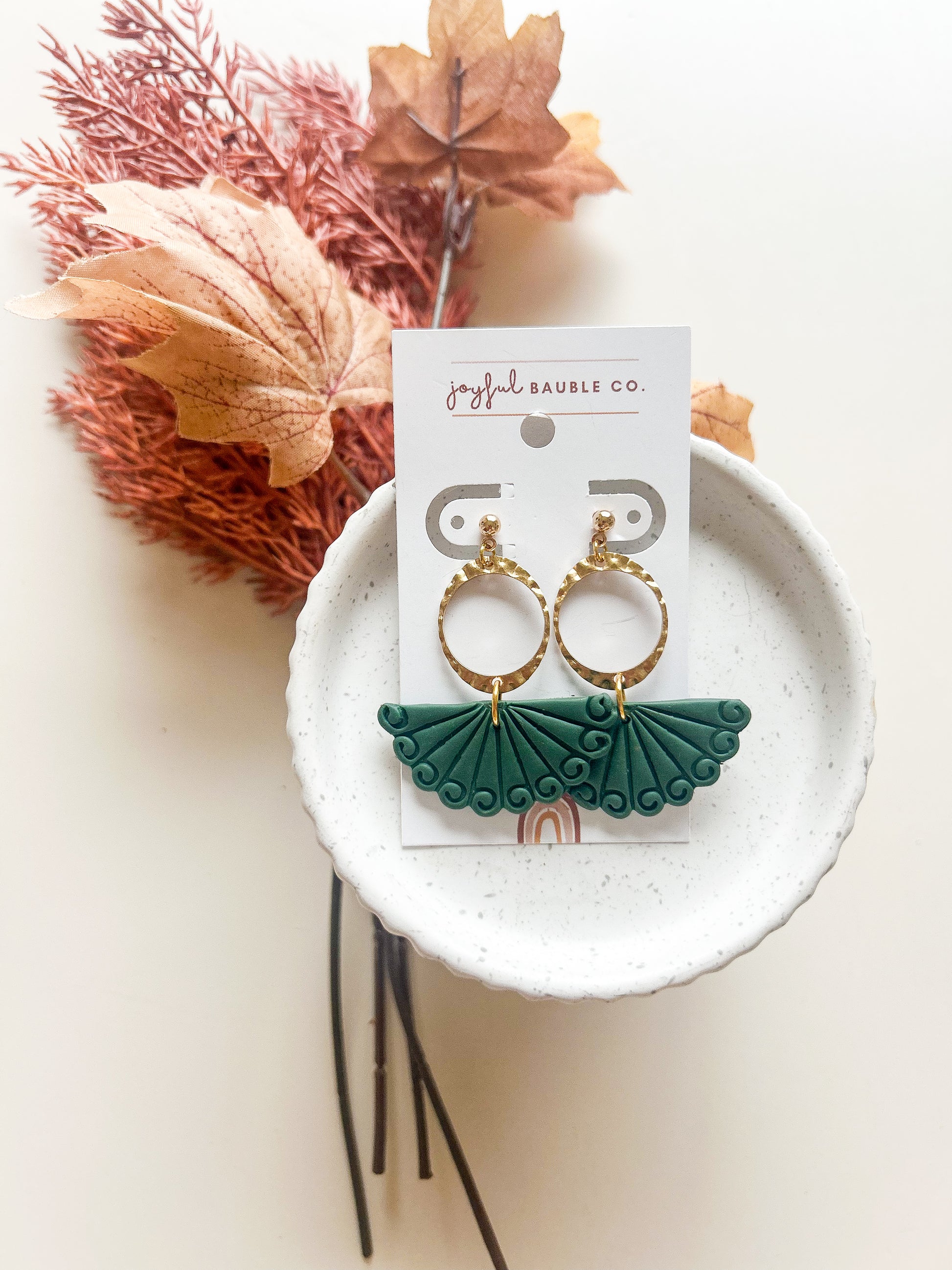 Item : Polymer clay fan earring with brass hammered circle accents. Art Deco